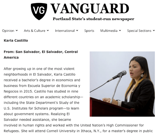 Como parte de la experiencia de la Beca Fulbright para maestría, 35 becarios de diferentes países del mundo participamos en el programa Pre Académico en la Universidad Estatal de Portland, Oregon. El periódico digital The Vanguard publicó una pequeña nota sobre algunos de los becarios.
